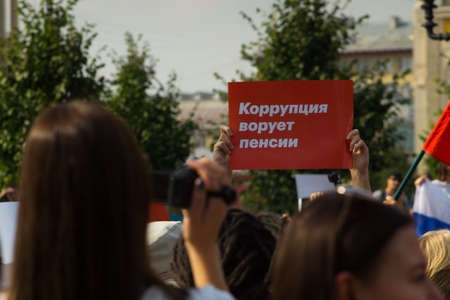 Moscow, Russia - September 9th, 2018: Red protest sign saying Corruption Steals Pensions, shown during anti-government rally at Pushkin Square in Moscow.