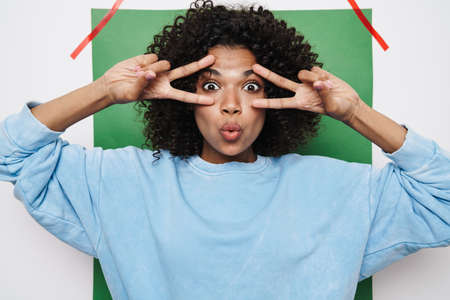 Image of funny african american woman making kiss lips and showing peace sign isolated over multicolored background