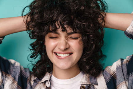 Pretty happy woman with curly brunette hair standing isolated over blue background