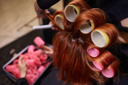 Closeup of red hair during hair dressing with curler.