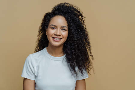 Horizontal shot of curly haired woman with healthy skin, toothy smile, enjoys being photographing, wears casual white t shirt, isolated on beige background. People, emotions and lifestyle concept