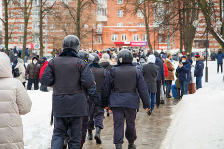 TULA, RUSSIA - JANUARY 23, 2021: Public mass meeting in support of Alexei Navalny, group of police officers going to arrest protesters.