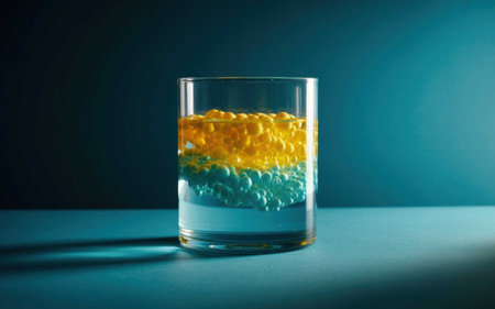 Colorful Liquid Layers with Floating Oil Bubbles in Glass Container