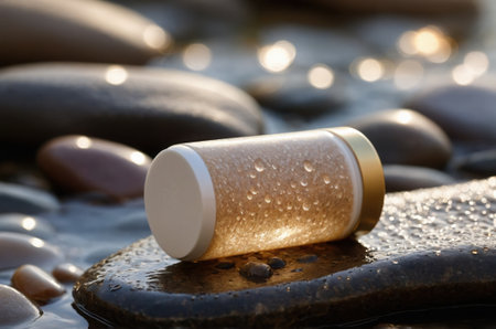 White plastic bottle on pebble beach, closeup. Nature background