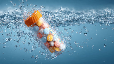 Pills in bottle with water splashes on blue background 3D rendering
