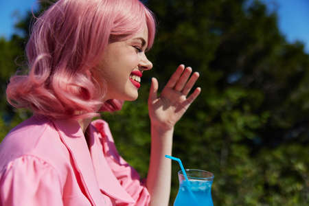 attractive woman in pink dress outdoors with cocktail Drinking alcohol