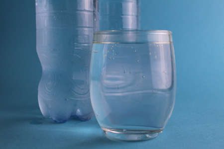 water in a glass and nearby there are bottles on a blue background. Cool soft drinks in summer in the heat. Clean drinking water. The balance of water. The rate of water consumption per day.