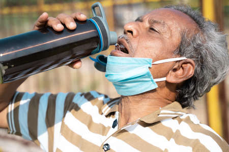 old man drinking water from bottle by placing mask below face during hot sunny day