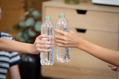 Mother and daughter sharing water bottles in a cozy home setting