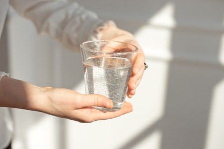 A glass of clean drinking water on a light background