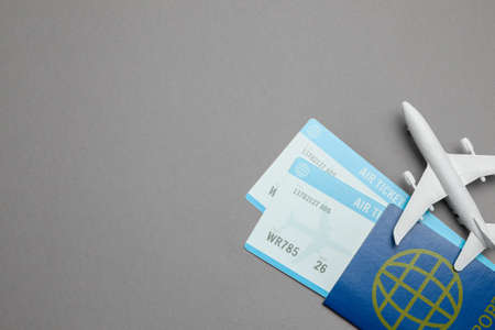 Tickets for plane and passport with model of passenger plane on gray background. Copy space for text.