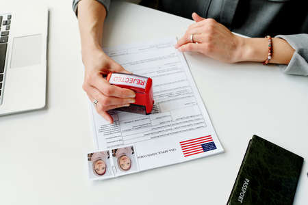 High angle view of unrecognizable woman working in US embassy rejecting travel visa application putting seal on it