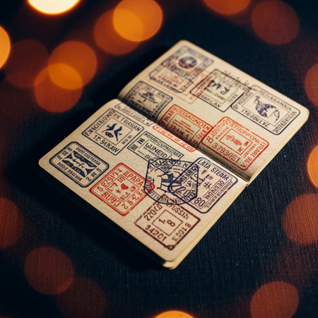 Immigration entry stamp on the inside page of a passport. Space for copy.
