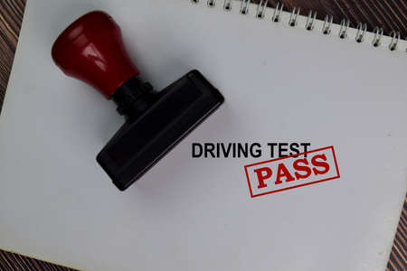 Red Handle Rubber Stamper and Driving Test Pass text isolated on the table.