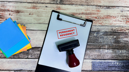 Red Handle Rubber Stamper and Permanent Residency text on a paperwork isolated on wooden background