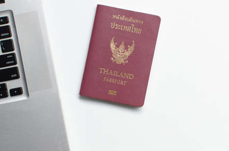 Thailand passport with laptop on white background, Find travel information