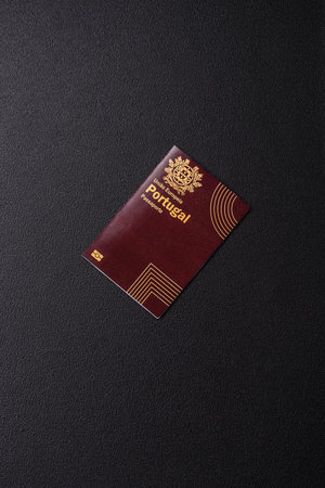 International passport of a citizen of Portugal on a dark concrete background, international travel