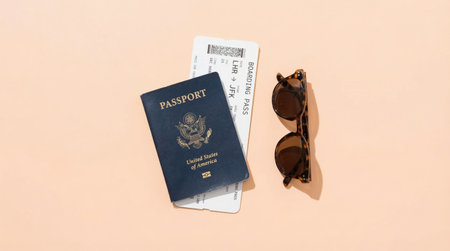 A passport, a boarding pass for a flight from London Heathrow to New York's JFK, and a pair of sunglasses are arranged on a plain surface. These items are ready for travel.