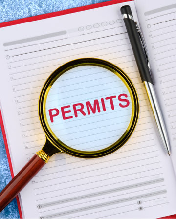 Business concept. The text PERMITS. viewed through a magnifying glass in a business notebook