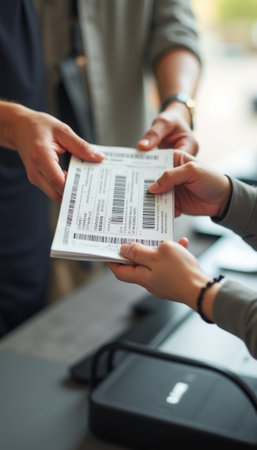 In a bustling environment, two hands are engaged in a transaction, exchanging tickets adorned with barcodes. The scene captures a moment of anticipation and excitement, highlighting the connection between individuals as they prepare for an upcoming event or journey.