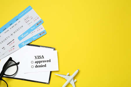 Flat lay composition with passport, toy plane and tickets on yellow background. Visa receiving