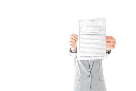 Businessman holding a paper with a checklist isolated on white background.