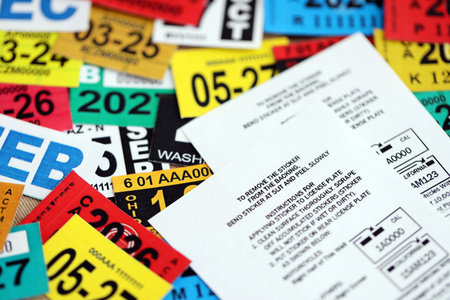 KYIV, UKRAINE - OCTOBER 1, 2025 Instructions on many United States car registration tag stickers in big pile close up