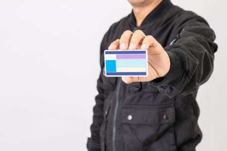 Portrait rider in black jacket holding and show blank Thailand driving licence. Over 400cc motorcycle in Thailand need especially licence. Studio shot isolated on grey background