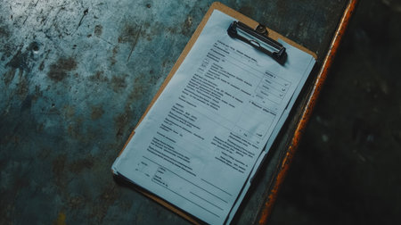 A clipboard holds a document with handwritten notes and yellow highlights. Two small receipts are placed nearby, all resting on a textured concrete surface.