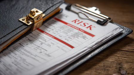 Close-up of a risk assessment document displayed on a clipboard, highlighting key metrics and analysis in a professional office environment for business evaluation.