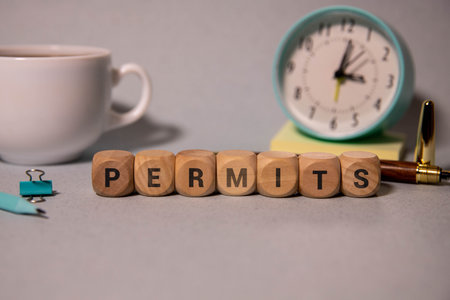 permits - word of wooden blocks with letters on a gray background. Reflection of the caption on the mirrored surface of the table. Selective focus.