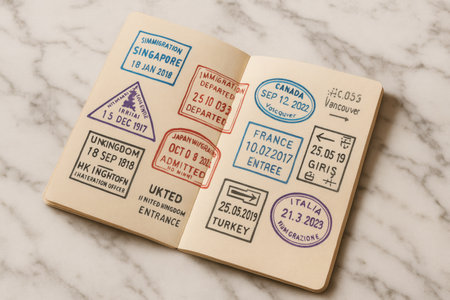 A passport filled with various stamps showcases countless travel experiences, lying open on a smooth marble surface, reflecting adventure and exploration.