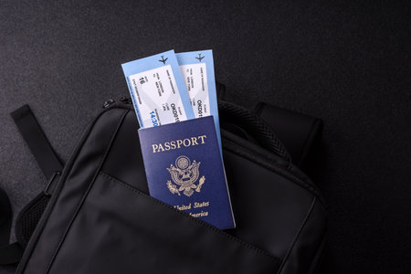 US passport, American visa for travel, document with tickets in travel bag. US passport as background for your design