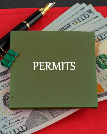 Business concept, Permit word written on a green sticker on the background of American dollars. Vertical photo