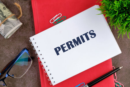 Business concept. The text PERMITS. on a red business notebook on a gorgeous green background