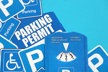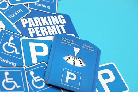 Parking permit paper notice tag and parking disc. Parking permit for people with disabilities concept