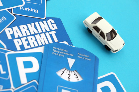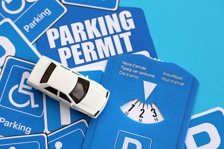 Parking permit paper notice tag and parking disc with toy car. Parking permit for people with disabilities concept