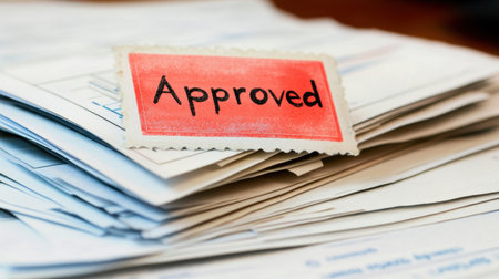 A close-up image of a stack of papers with a prominent Approved stamp, symbolizing successful completion of documentation and administrative tasks.