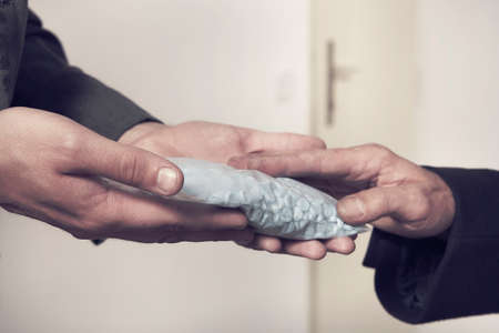 Hand of addict man with money buying dose of cocaine or heroine or another narcotic from drug dealer. Drug abuse and traffic concept.