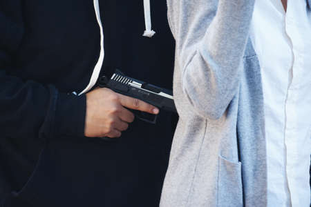 Thief armed man rob woman by gun on street so scared shocked face. Frightened asian woman was rob aggressive by danger bandit man. Robbery thief using gun burglar. Criminal aggression crime concept.