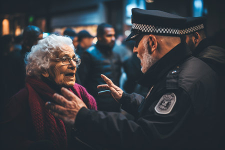 portrait of elderly Muslim woman with gray hair arguing with policeman on street