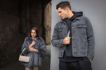 Criminal with knife hiding behind wall and waiting for victim near alley