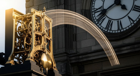 Mechanical Pendulum Timepiece with Exposed Gears and Motion Blur Against Stone Clock Face