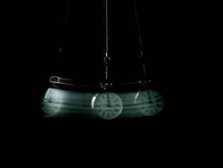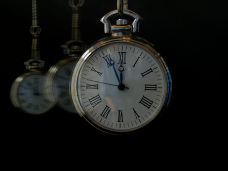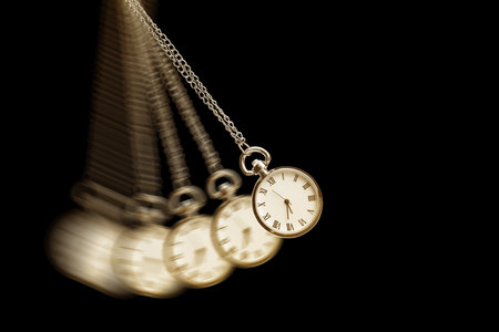 Hypnosis session. Vintage pocket watch swinging on black background, motion blur effect