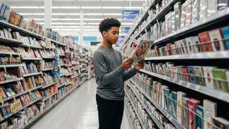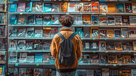 Man read the magazine stand in front of cashier in the stationery book store. AI Generated.