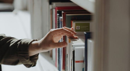 Woman hand picking up book from bookshelf at home. Closeup of female hand picking book from shelf. Education and knowledge concept