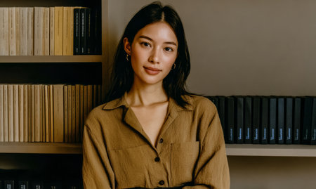 A woman poses in front of tall bookshelves filled with various books. She wears brown clothing and stands in an indoor space with soft lighting.