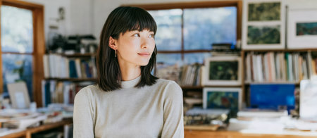 A woman looks thoughtfully while sitting in a studio filled with books and artwork. The space is bright with large windows letting in daylight. She appears focused on her thoughts.
