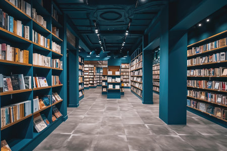 Modern bookstore interior with shelves filled with diverse books and cozy reading nooks