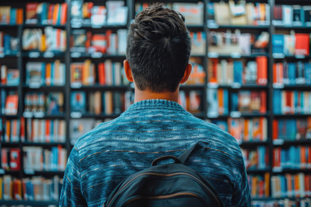 A young person stands in a library, gazing at the rows of books. This image captures the essence of discovery, learning, and a quiet passion for knowledge.